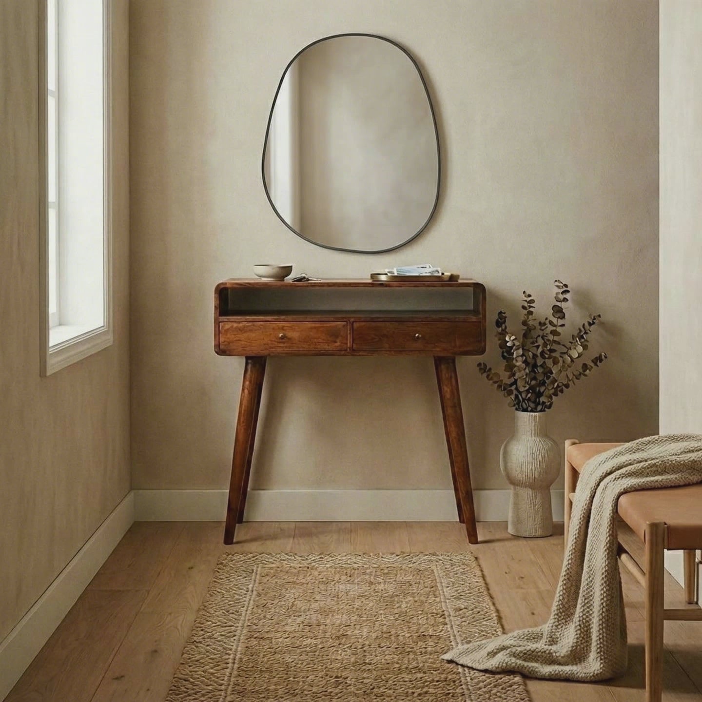 Crafted from solid mango wood and finished in a deep chestnut tone, Century brings warmth and visible grain while maintaining a clean, well-judged appearance. Softly curved edges and simple lines help the piece sit comfortably in both contemporary and mid-century influenced interiors.